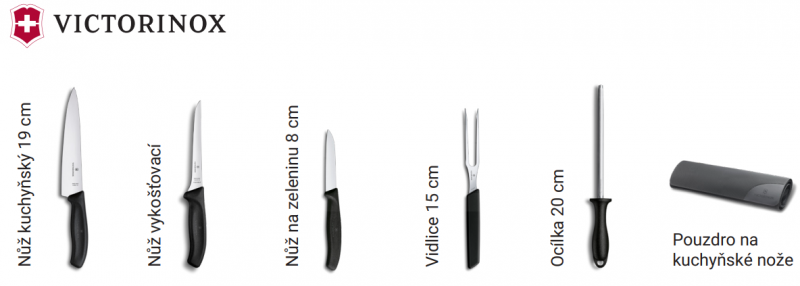 description: The set includes: 3 knives, a fork, a sharpening steel, and a case from VICTORINOX.