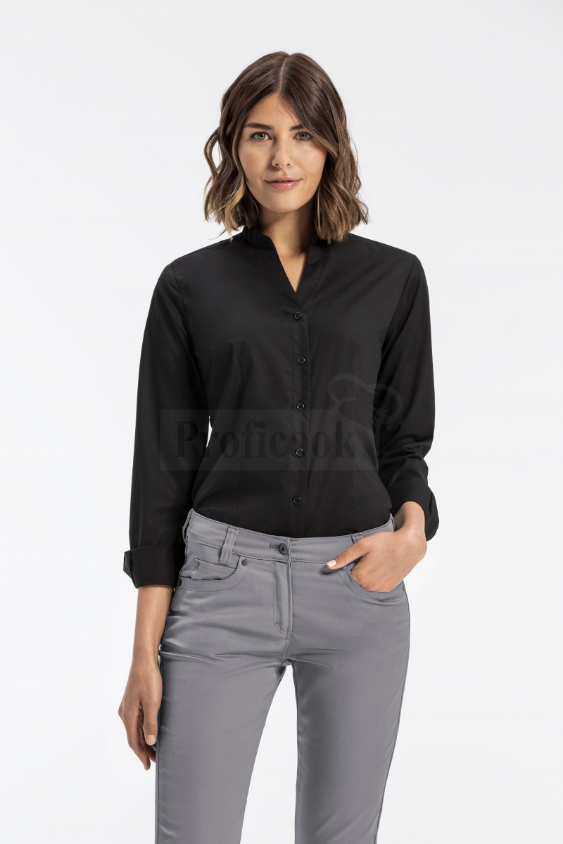 popis: 120 g/m², 57% bavlna, 40% polyester, 3% lycra, halenka v asijském stylu s krátkým nebo dlouhým rukávem, snadné ošetřování, malý stojáček, knoflíky v barvě halenky, skrytá léga (jen horní knoflík je viditelný), přední záševky pro přiléhavý střih, postranní rozparky, lehce zaoblený spodní lem