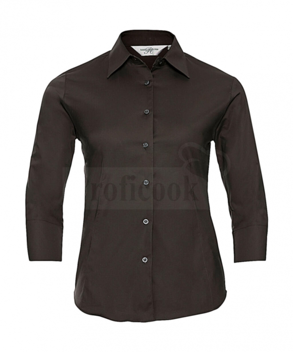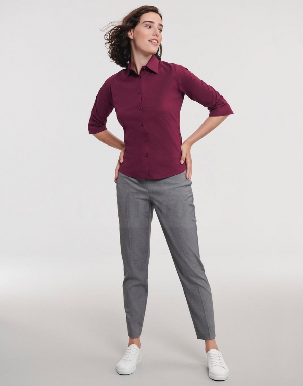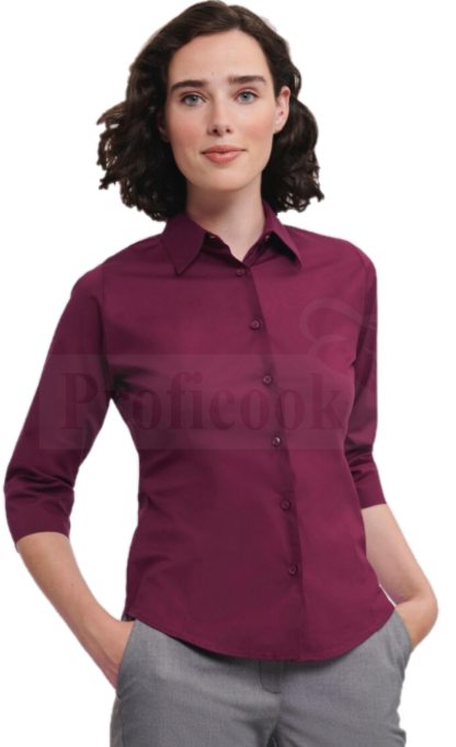 popis: Snadné ošetřování, klasický límec s knoflíkem, barevně sladěné knoflíky, 3/4 rukávy s rozparky, 2 záševky na předním a zadním dílu pro projmutý střih.